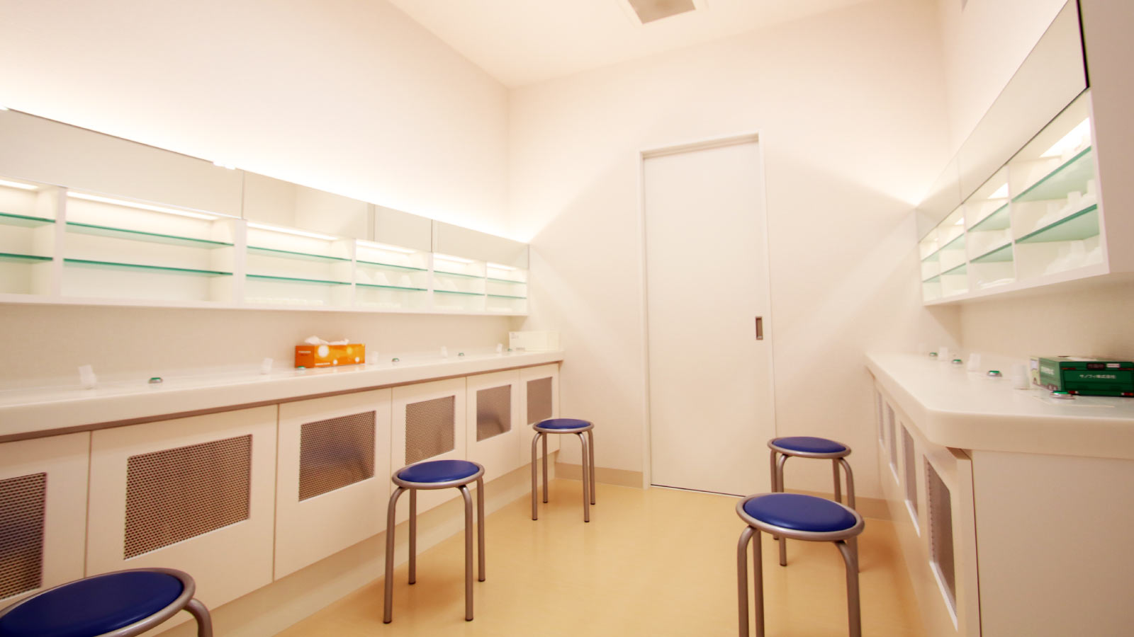 薬を含んだ蒸気を噴射して症状を緩和させる吸入器です。当院では直接見えないように人造大理石の下に機械を設置しています。副鼻腔炎・咽頭炎・喘息など、色々な症状で使用します。