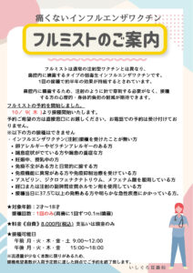 ・フルミストは接種後にウイルス排泄が起こるため接種後2週間は乳児や免疫不全の方との接触を控える必要があります。