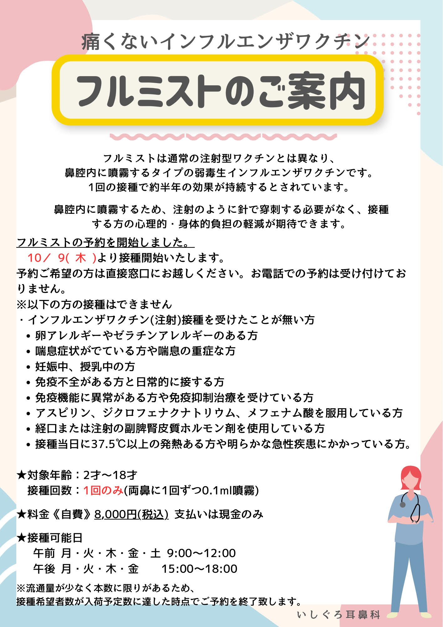 ・フルミスト接種後(※多くは3日~7日後)に約10%の方に発熱症状、約30%の方に鼻汁、咽頭痛、咳、頭痛などの感冒症状が出現します。また非常にまれですがアナフィラキシーショックなど強い副反応が起こることがあります。